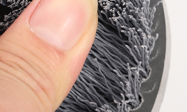 耐久性: ブラシ の 繊維 の 全 長さ に 磨砂 粒子 が 分散 し て い ます.外部 の 繊維 が 磨損 さ れる と,内層 に は 絶えず 新しい 磨砂 粒子 が 露出 し て い ます.切断力を維持するこれは,コーティングされた磨材よりも寿命が長い結果です.
