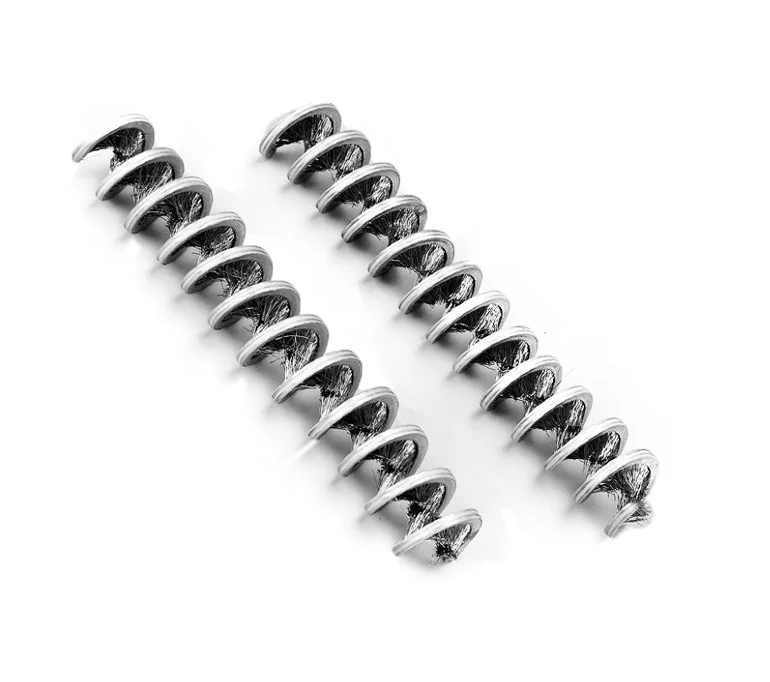 pointing towards the center. The brush is then stretched open to the required pitch, sometimes referred to as lead.Brushes can be manufactured with various coil spacing, fill materials, metal strip sizes and shaft and core diameters in steel, stainless steel or aluminum.